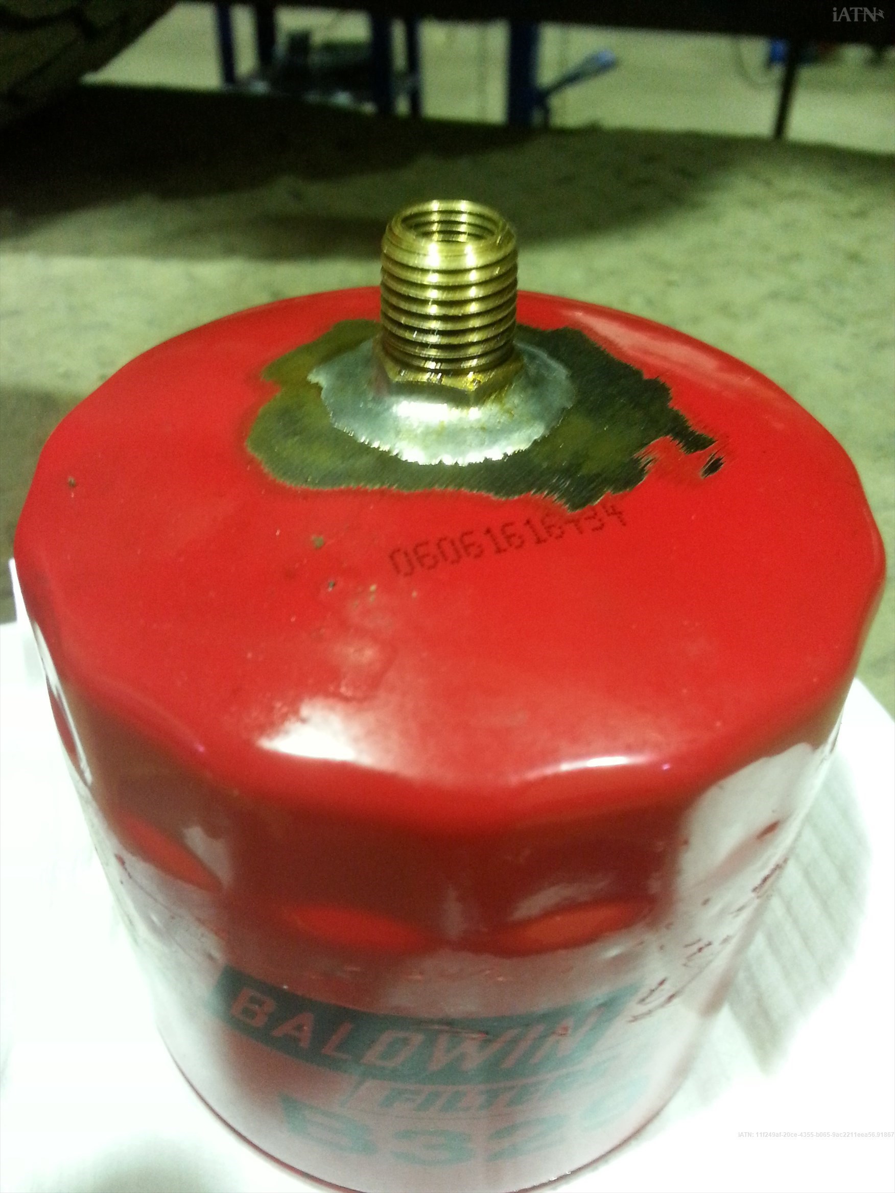 1/4" X 1/8" NPT reducer bushing soldered onto oil filter with 50/50 plumbers solder and flux