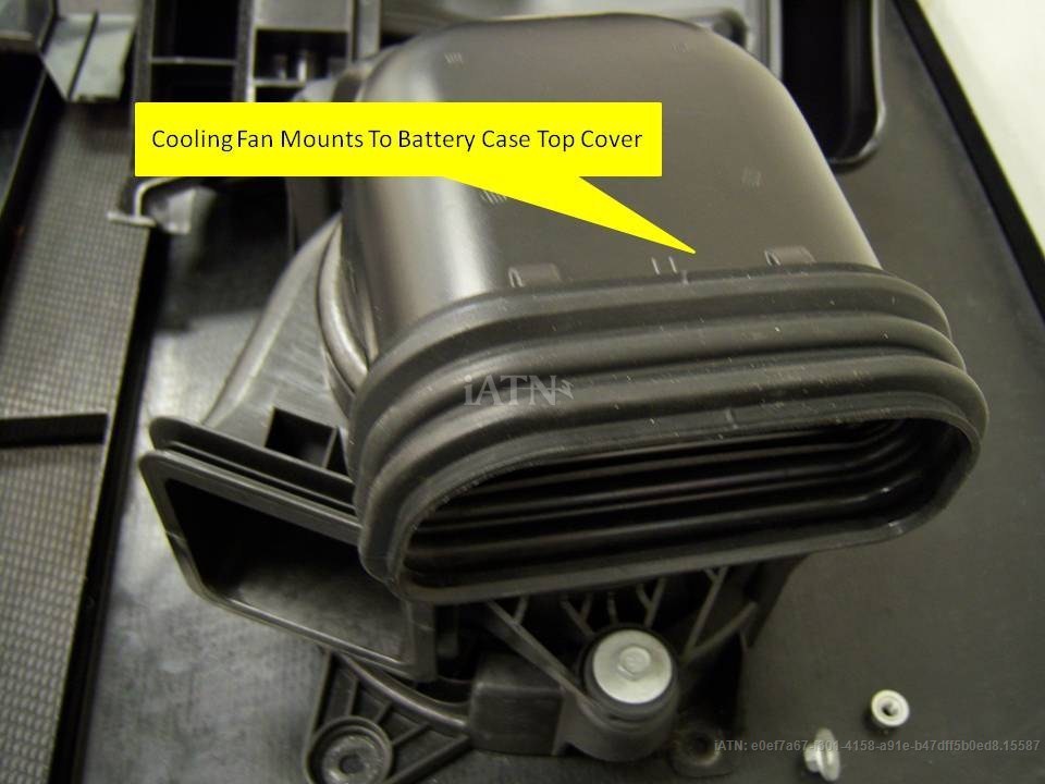 Cooling fan mounts on top of battery case and draws air through battery, from grille in rear passenger compartment shelf.