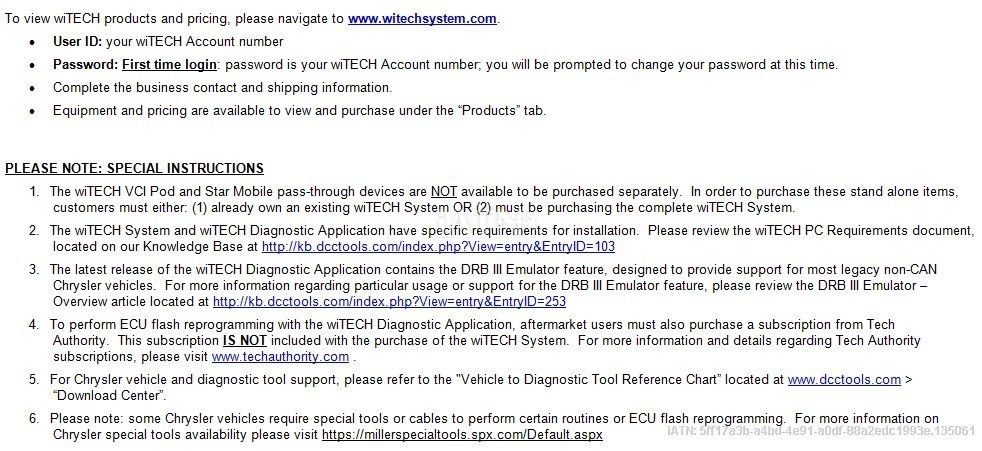 Instructions on wiTECH account access, hardware purchasing, ECU programming, support, tool-to-vehicle application, etc.